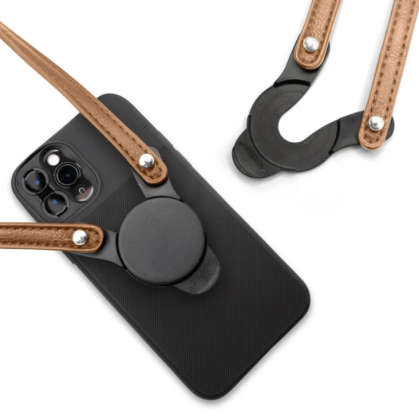 This smartphone lanyard comes in supple brown or black faux leather, and the strap includes a sliding comfort pad to prevent irritation on your neck or shoulder while your iPhone is hanging from it.