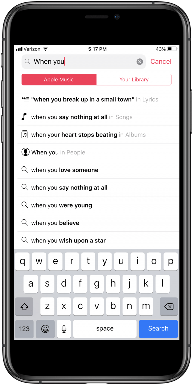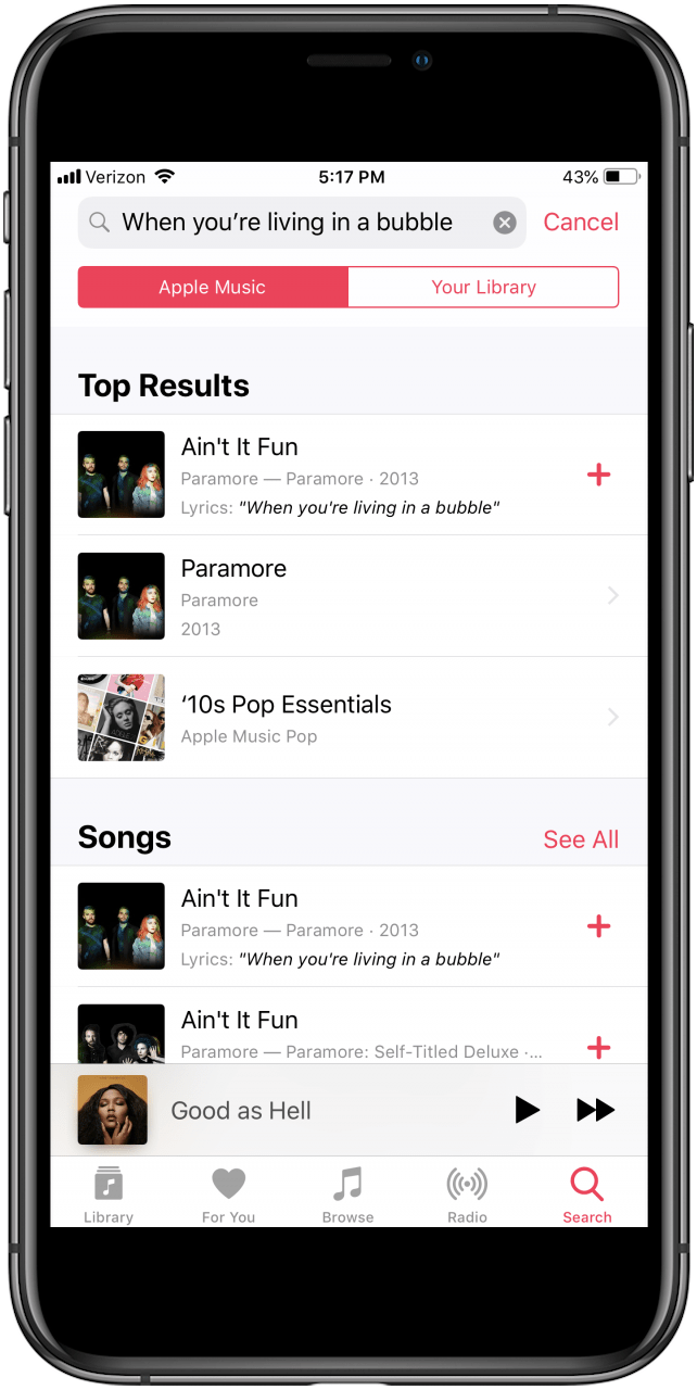 Apple Music doesn't provide the lyrics for all songs, so searching by lyrics may not help every time. Also, if you're misremembering lyrics it's likely you won't get accurate search results. But this feature can get you a little closer to finding just the right song.