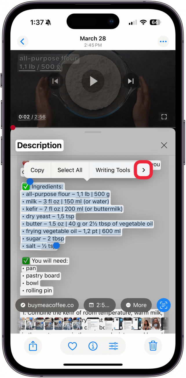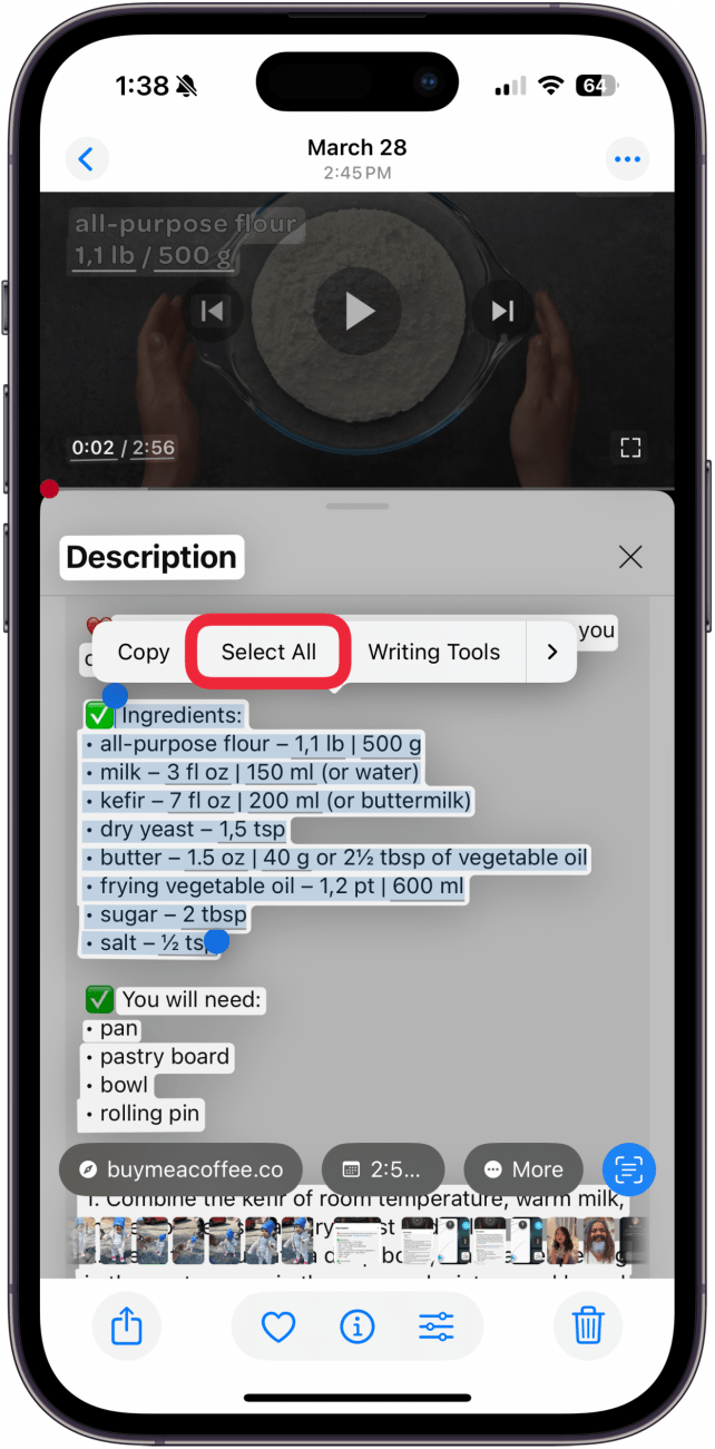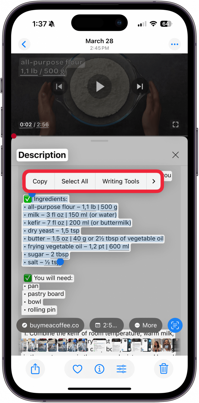 - You'll see a toolbar where you can choose Copy, Select All, Writing Tools, Look Up, Translate, Search Web, Speak, or Share (sometimes, you may see a more limited list of options).