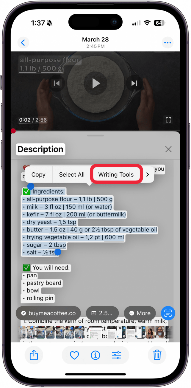- Tap Writing Tools to access the Writing Tools menu. While they won't change the image, your iPhone can offer alternate text ideas for what is displayed.