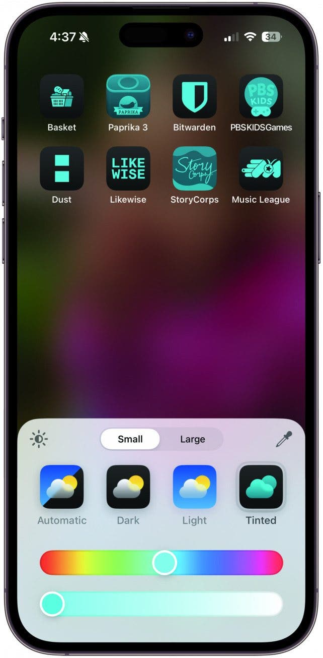 Customizing app icons used to be complicated but with iOS 18 it just takes a few taps! Long press on an empty part of your Home Screen until it enters jiggle mode. Tap Edit, then select Customize. Pick between Automatic, Dark, Light, and Tinted. Tinted will automatically pick a color scheme that matches your wallpaper, or you can customize it by using the sliders. If you tap on the sun icon you can pick between a lighter look or a darker look. Select Large to see larger app icons and no text underneath them. If you select Small, you will see the default-sized icons with the app names underneath them.