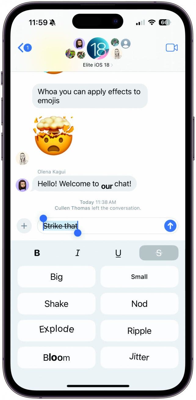 Have you ever thought your text could have a little more pizzazz? With iOS 18, you can animate your typed words, letting them grow, shrink, explode, shake, and more. All you have to do is tap the text formatting button to the right beside your word suggestions and select the effect you want. You can select it before typing to animate an entire sentence or select a single word or phrase to animate. As you type, your iPhone might give you text effect suggestions you can implement by tapping.