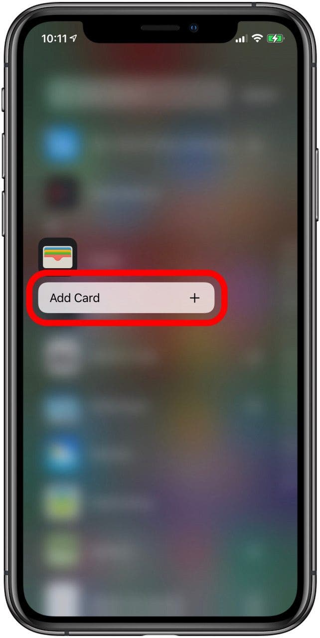 - If your Wallet App is in the App Library, touch and hold the app icon to make Add Card appear.