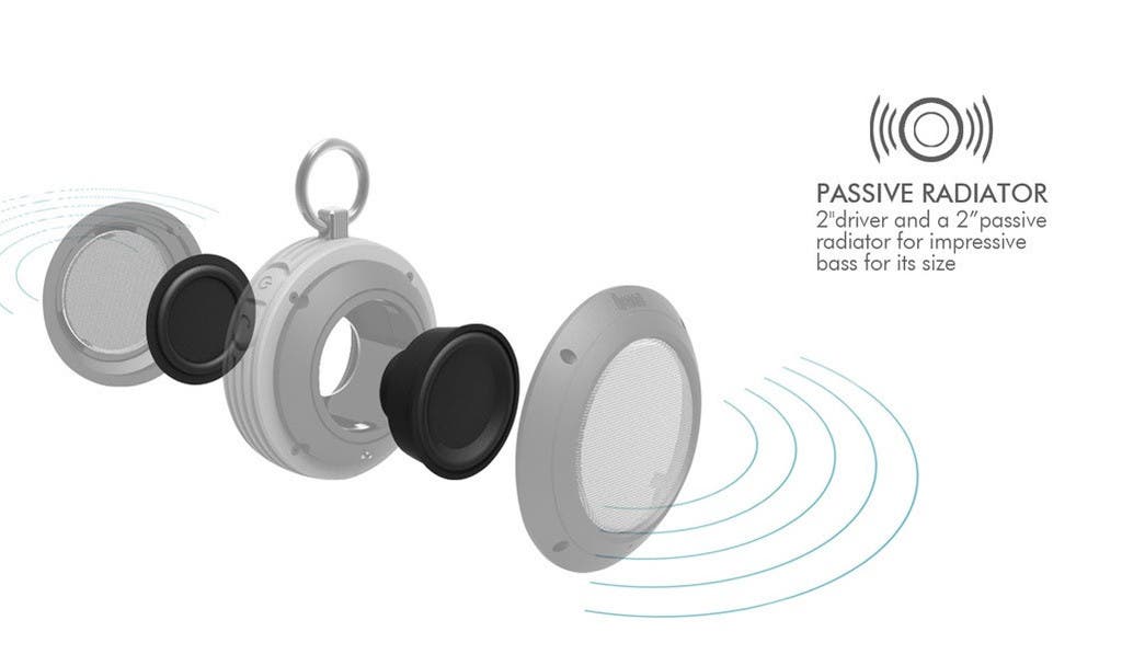 The Swimmer is the only one of the speakers in this roundup that is completely waterproof. This appropriately named speaker can be submerged up to 3 feet for 30 minutes, which is very convenient if you'll be anywhere by the water. It has one single, large driver which puts out a strong, well-balanced sound. The Swimmer includes both a suction cup for attaching it to a pool or shower tile as well as a flexible “tail” which can serve as either a directional stand or a reliable clip-on point of attachment.