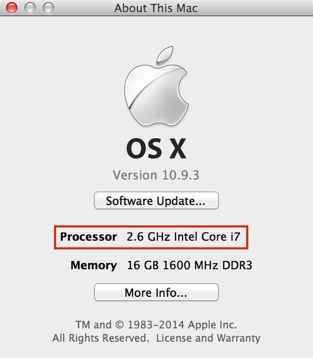 If you own a Mac built after August 2006, it has an Intel processor, which is required for iOS app development. If you're not sure when your Mac was built, you can see what processor you have by clicking the Apple icon in the main menu on your desktop and selecting About This Mac. In the About This Mac window, just look below the Software Update… button to see if your Mac has an Intel processor.