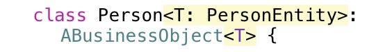 This declares Person as a generic class with T as a placeholder that only works with instances of the PersonEntity class. The T placeholder is used as a type argument for the ABusinessObject superclass.