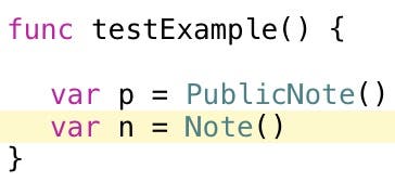 - Select the AccessControlDemoTests.swift file in the Project Navigator and add the following code to the testExample method. This code creates an instance of the Note class:
