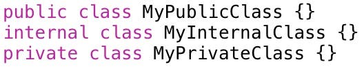 Again, if you don't specify an access modifier, the default access level for your code is internal.
