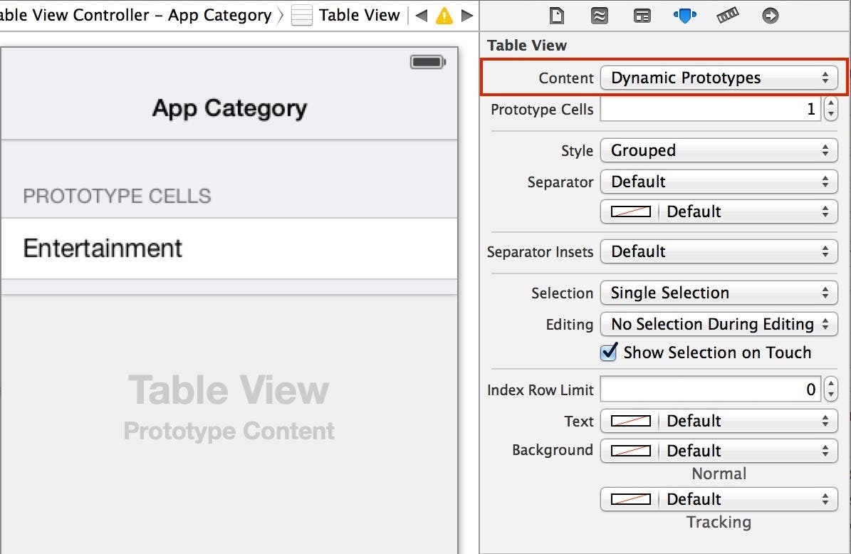 - Now it's time to change the methods of the table view controller that are used to fill the associated table view in the App Category scene. In a future post I'll discuss table view controllers in greater detail, but for now I'll just give you the information you need to know to understand the basics.