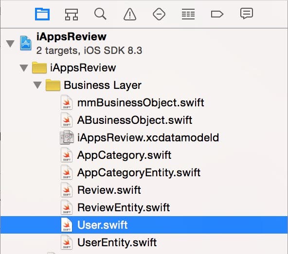 - Click the Next button to launch the Save File dialog. In the Save As box, change the name of the class to User.swift. Click the Create button to add the new User class file to the Project Navigator as shown in Figure 8.
