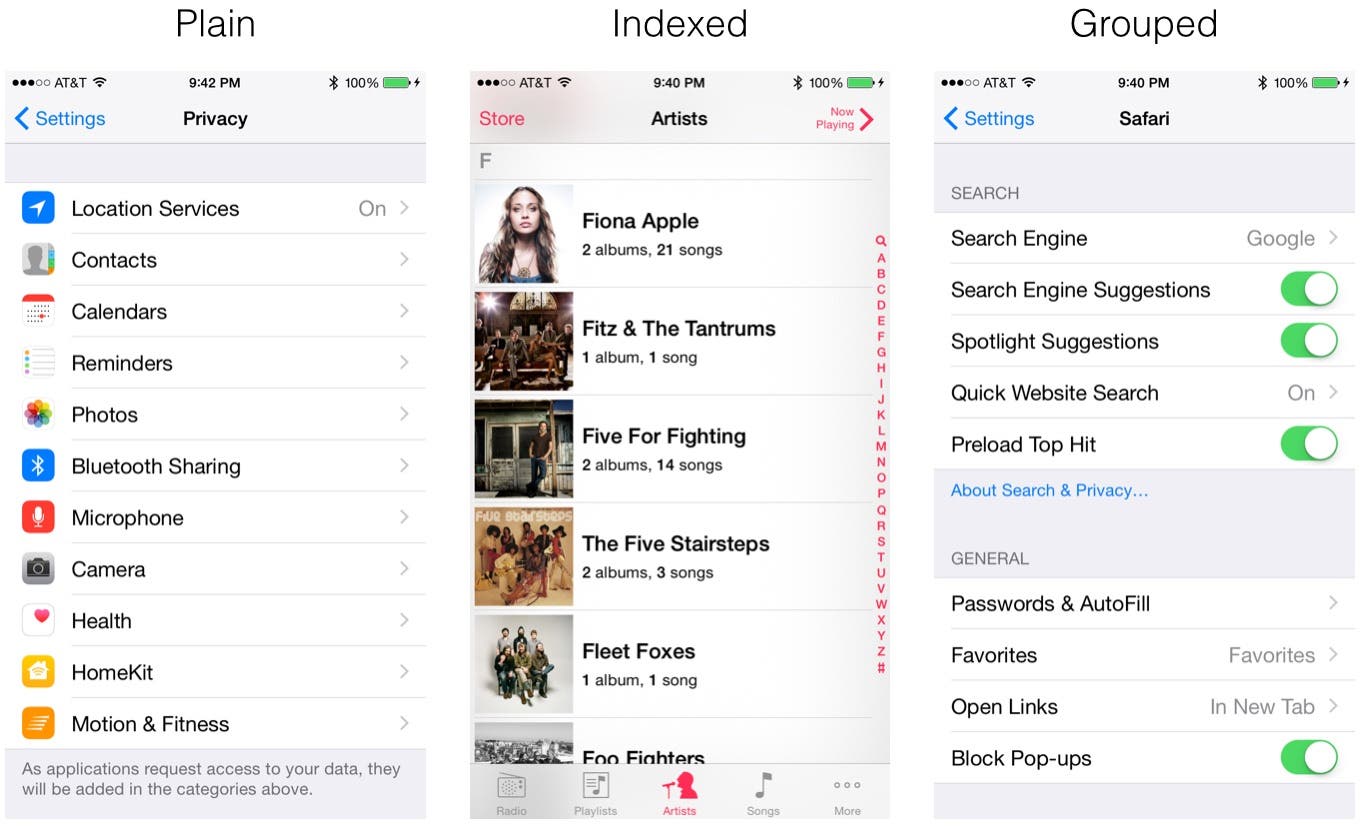 There are three main table view styles—plain, indexed, and grouped—as shown in Figure 2.