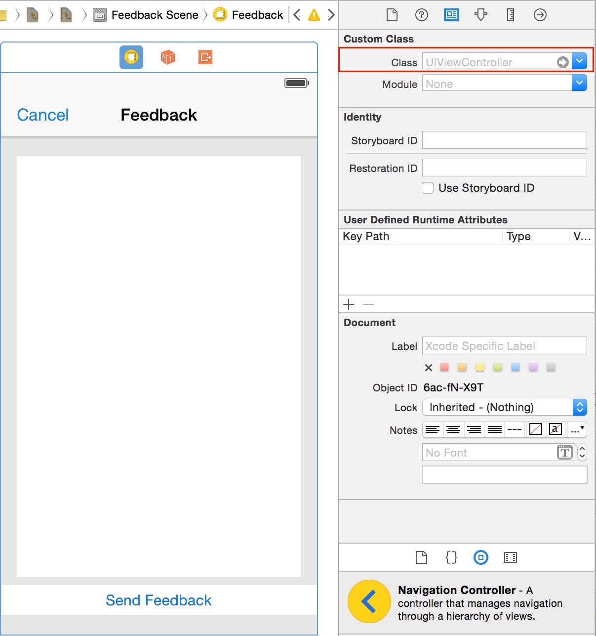 - In the Identity Inspector's Class combo box, enter FeedbackViewController. As soon as you start typing the first few letters, Xcode should automatically fill in the class name FeedbackViewController. However, due to a bug in Xcode, this doesn't always happen. If the class name doesn't auto-fill, make sure you enter FeedBackViewController with the exact upper/lower case letters shown here.