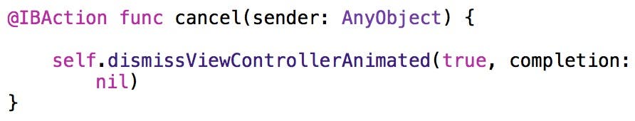 As it stands right now, there is no code in the cancel method (between the curly braces), so if you were to run the app in the Simulator, clicking the Cancel button still wouldn't do anything. Fortunately, all you need to do is add one line of code to this method to hide the Feedback view.