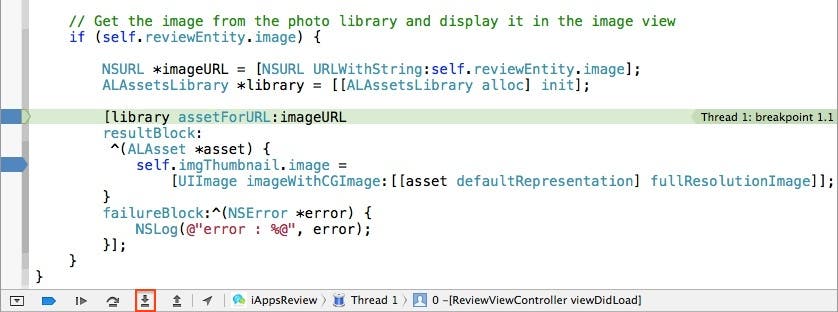- Next, click the Step Into button at the top of the Debug area, highlighted in red in Figure 14. You may be surprised to see that execution jumps to the bottom of the if statement as shown in Figure 15. The code in the block isn't executed yet. In fact, if you click the Step Into button a second time, execution jumps to the bottom of the viewDidLoad method.