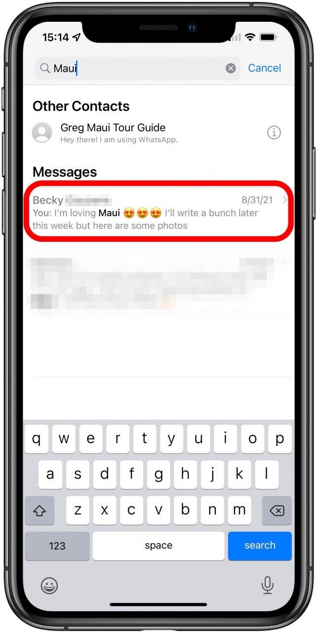 - Type the phrase, words, event, or person you’re searching for. Messages that match will appear with the search terms highlighted in bold. Tap the relevant message.