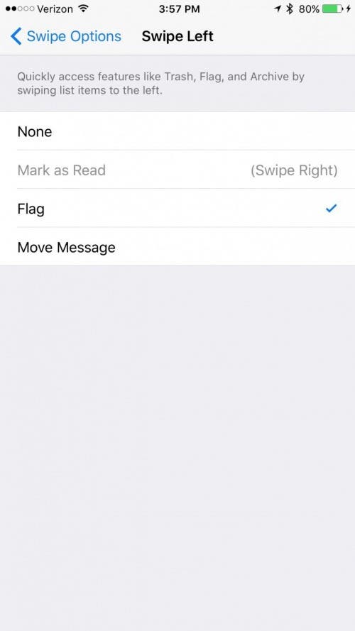 - The default is Flag for a left swipe and Mark as Read for a swipe right. To change the swipe left gesture, tap on > to see the other options.