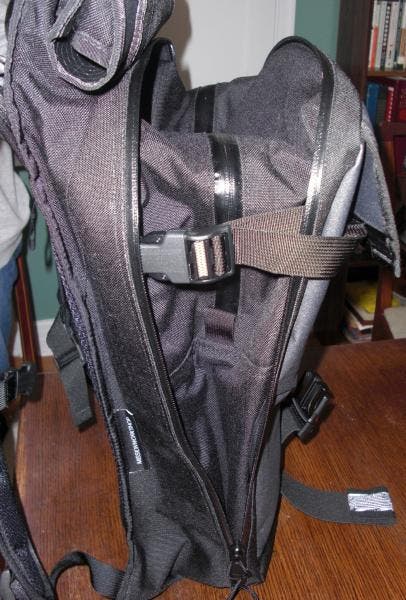 I had placed the laptop in the weatherproof compartment that is next to your back. A smaller laptop would be a better suited option here, especially if you are planning on going through a TSA checkpoint at an airport. (But if you are just talking about the weight of my 15’ computer, the bag handled admirably).