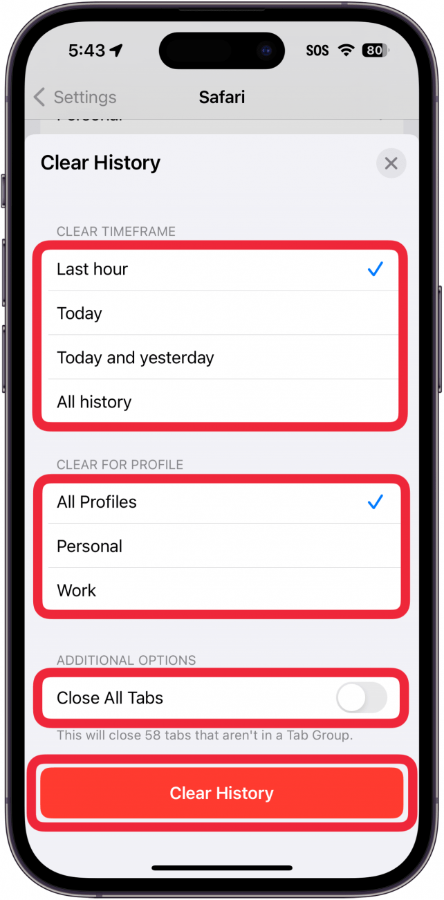 - Select the timeframe and profiles for which you want to clear data, and whether or not you want to close all your tabs. Then, tap Clear History.