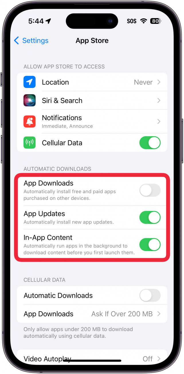 - Toggle off Apps and App Updates under Automatic Downloads.