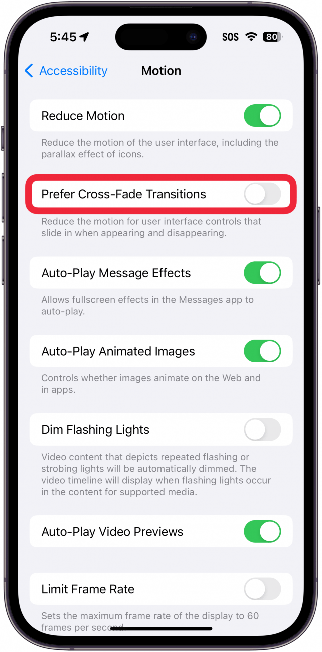 - A new toggle, Prefer Cross-Fade Transitions, will appear, which you can choose to leave off or turn on. This toggle essentially makes it so that almost every animation becomes a cross-fade. For example, when the toggle is off, opening conversations in the Messages app will still have the conversation slide in from the side of the screen. When the toggle is enabled, the conversation will open with a cross-fade instead.