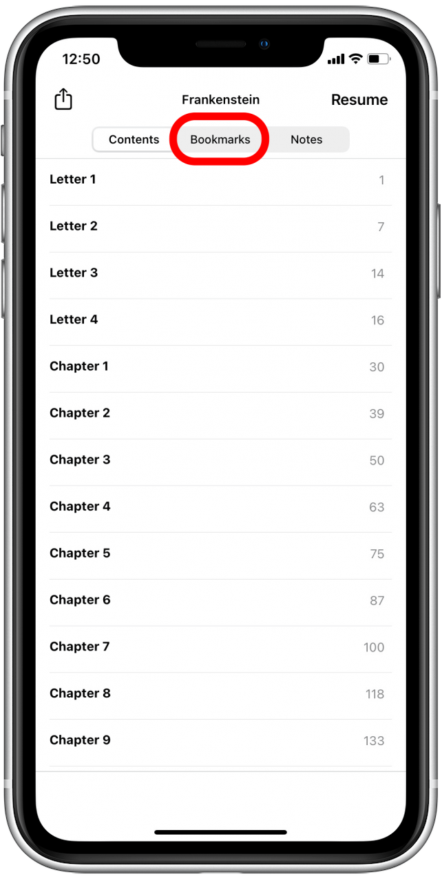 - You will see a list of bookmarks organized in the same order they appear in the book.