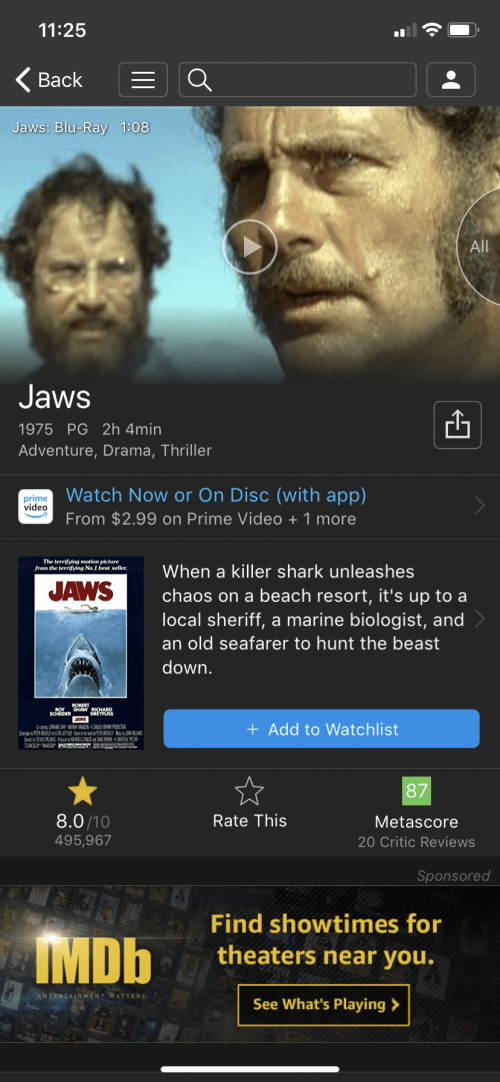 IMDb provides an attractive amount of information for over 5 million titles. With content like plot summaries, clips, user and critic reviews, I can browse titles and add whatever strikes my interest to my Watchlist. I'm a sucker for trailers, which are sometimes the best part of a movie, and there's plenty to watch on this app. Who doesn't love the hype of dramatic music, action shots, and one-off sarcastic remarks in three minutes or less? IMDb is owned by Amazon, and included on a movie or tv show's page is whether it's available to view on Amazon Prime or if you can purchase a physical copy through Amazon. For going out or staying in, IMDb helps you choose movies and shows to enjoy.