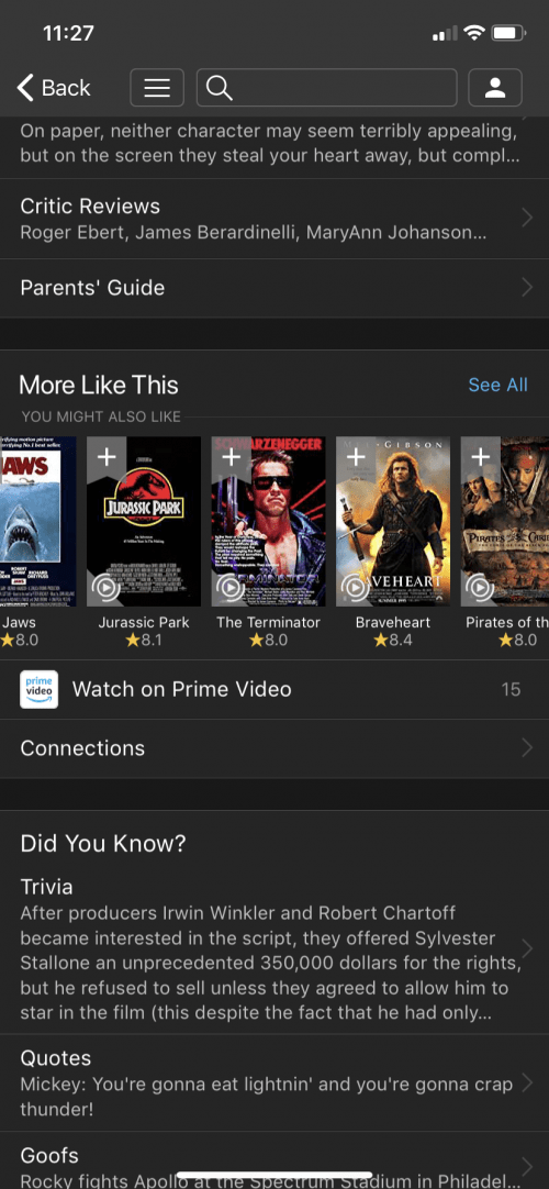 Read reviews from critics and IMDb users to get a feel for what you're about to watch. The easy-to-spot rankings, which rate a movie 1–10 and depend on a weighted mean average, generally give an idea of what you're in for. Using this rating system, IMDb maintains a Top 250 Films list, which includes recent offerings like 2018's Bohemian Rhapsody and extends to early cinema such as 1931's City Lights starring Charlie Chaplin. The Top 250 Films list crosses genres and international borders, so if you're wanting to dip your toes into what are considered classics by over 8 million users, browse the Top 250 to plan a movie night. I'm a huge fan of enjoyably bad films, so I'm happy to choose movies from the 100 Lowest Rated movies as well. Filled with spin-offs, sequels, and remakes, the Bottom 100 has had me introduce a number of wonderfully terrible movies to my friends. As you rate, review, or even just check out a title's page, IMDb will recommend similar content. So, start with one title like Sylvester Stallone's Rocky and keep the lineup going with Terminator, Kill Bill, and Jaws.