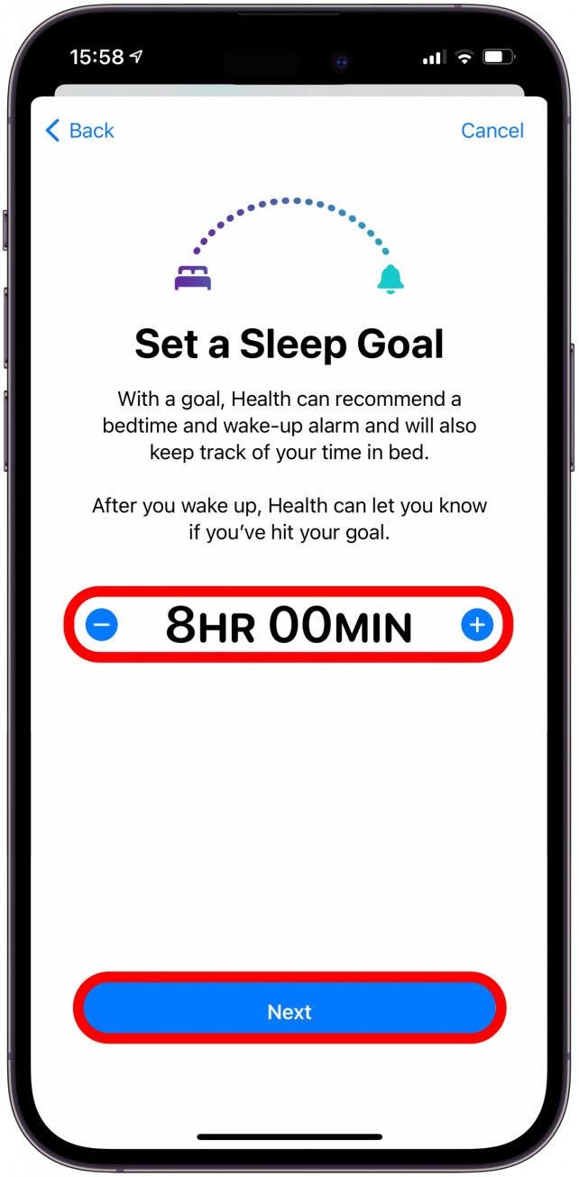 - Set a Sleep Goal using the plus and minus icons, then tap Next.