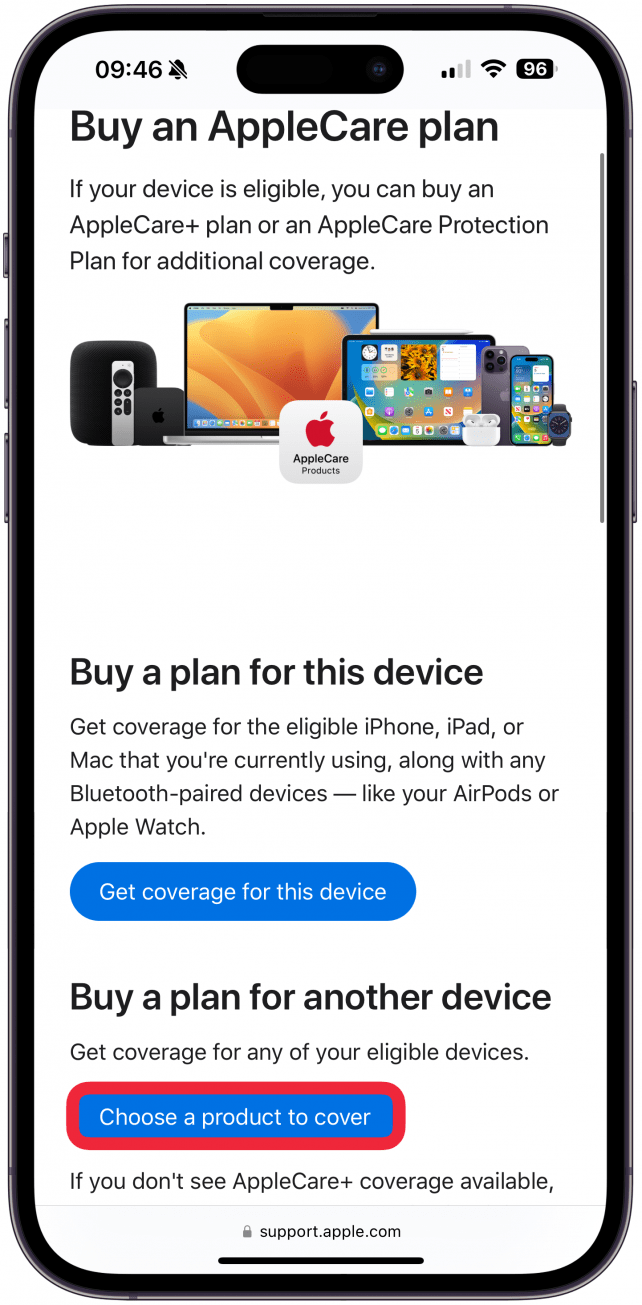 - Open Buy an AppleCare plan and tap Choose a product to cover.