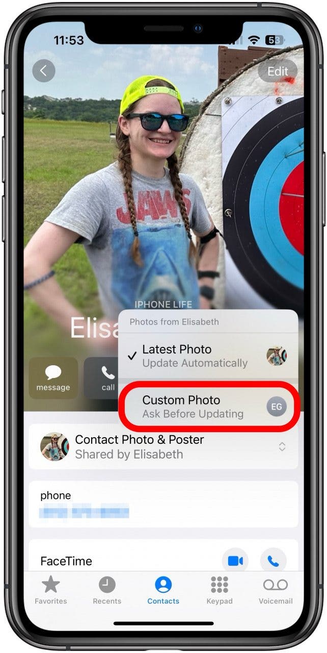 - Open their contact card and Contact Photo & Poster, then tap Custom Photo to create your own.