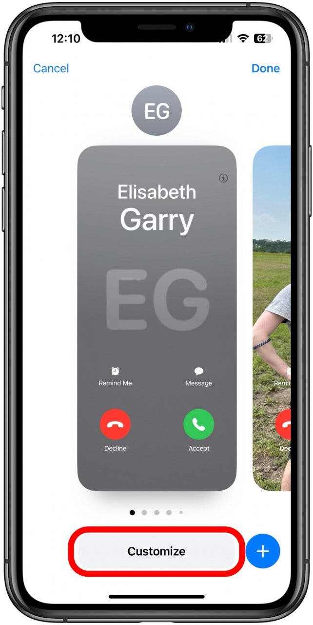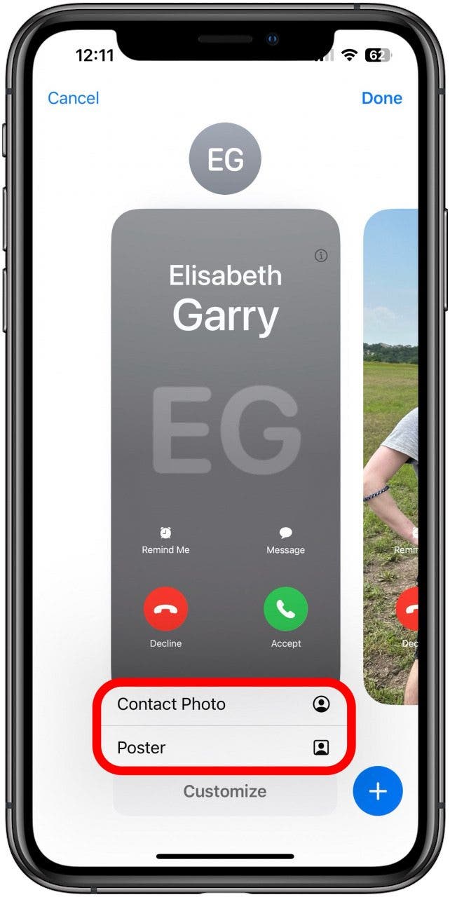 - If you chose Add Photo, choose a photo for their Contact Photo. If you tapped Edit, scroll through the available Contact Poster options or tap Customize to create a new one for that contact.