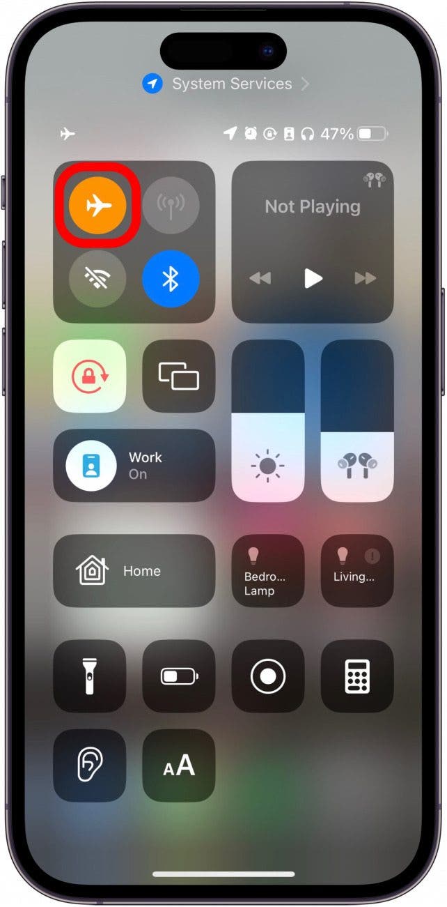 Turning Airplane Mode on and off softly resets your wireless connections, by turning off your Wi-Fi and cellular. All you have to do is tap the airplane icon in the Control Center, wait a few seconds while your phone turns off its wireless connection, then tap the icon again to turn it off again. You’ll know whether or not Airplane Mode is on if the icon is orange: