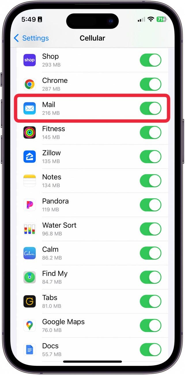 If you are not somewhere with a good internet connection, you may want to enable cellular data for the mail app of your choice. This way, if you are ever out of range for Wi-Fi, you can still get access to your emails. You can turn cellular data on for the app by going to Cellular in Settings.