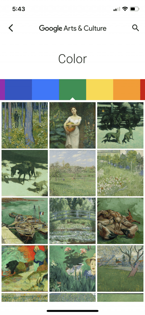 If you’re not sure where to begin, the Home tab has hours worth of interest in and of itself. Near the bottom of Home you can Explore with Street View, which allows you to look at various different important places as though you were there with a 360-degree view. There are some museums you can virtually walk through using the app, just like Google Street View in the Maps apps lets you explore a city. Below that, you can explore starting with color and tap to see even more work with that main color.