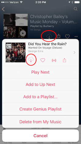 Once a song or playlist is added to My Music, the + icon will change into a cloud icon. Tap the cloud icon to download the song or playlist to your device for offline listening.