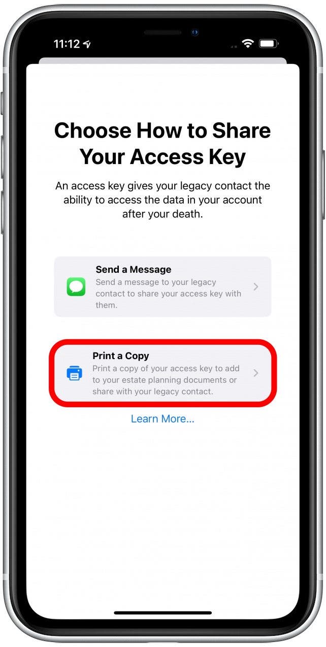 - You can select Print a Copy so that you can print out and add the key to unlock your Apple ID to your estate planning documents and/or living will.