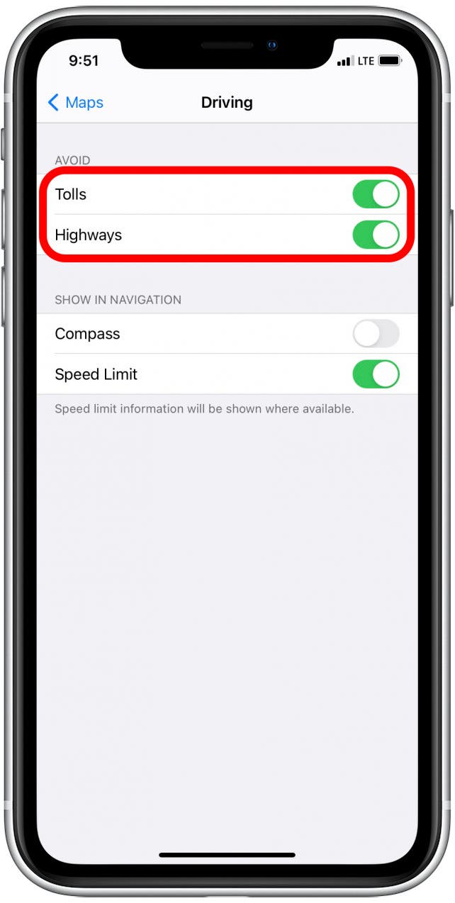 Apple Maps enables you to change a setting to avoid toll roads, but it can't be found within the app. When these features are enabled, Apple Maps will avoid toll roads and/or highways whenever possible and convenient. This way, when you search for a destination, Apple Maps will offer several routes showing distance and estimated driving time. So if avoiding highways creates a much longer route, you can see this and decide whether or not you want to take the highway. To enable the avoid toll and highway features: