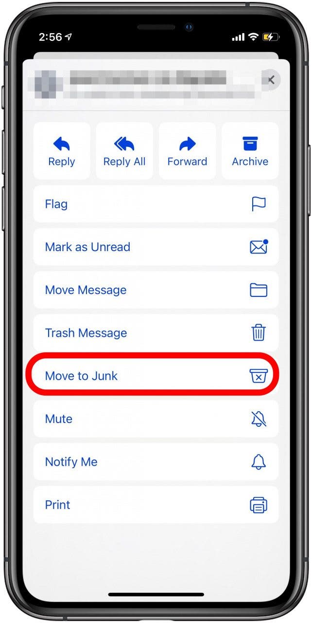 - The next screen contains a world of options for that message. The one you’re looking for is “Move to Junk.” Scroll to that and tap that option.