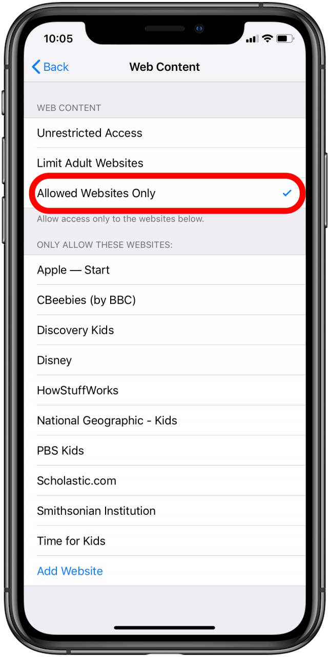 - Tap Allowed Websites Only for even greater restrictions. Your child won't be able to visit any sites that aren't on the allowed list.