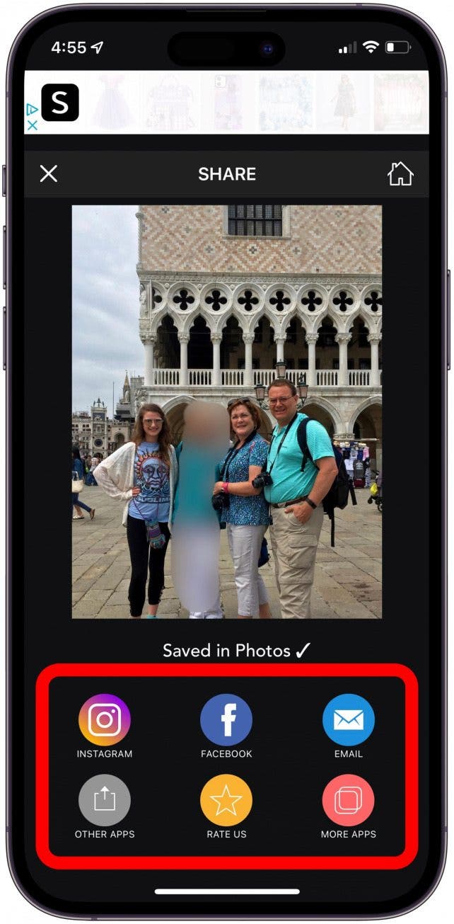 - Your photo will automatically save to your camera roll. You can also select where you'd like to share the photo directly.