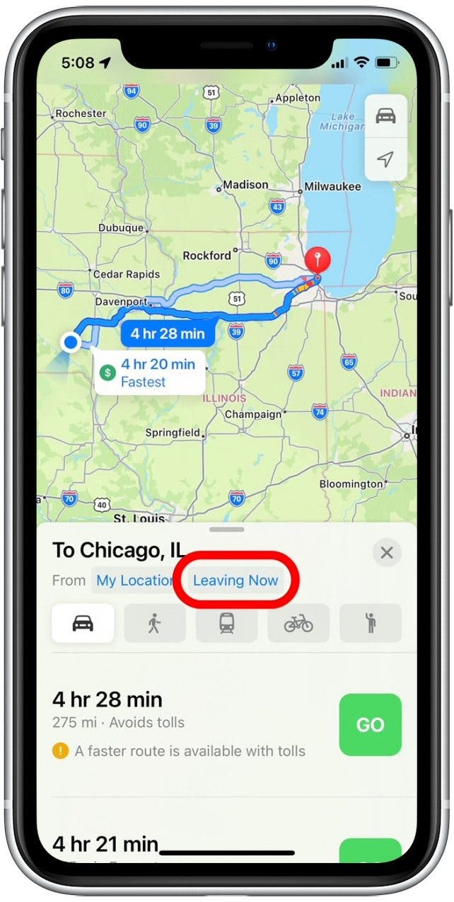 When you set a departure date and time in Apple Maps, you can preview your best route and estimated travel time with traffic. This is useful for trip planning, as your travel time will likely vary depending on the day of the week and the time of day you decide to leave. By testing different departure times in Apple Maps, you can determine the best time to leave. Here's how: