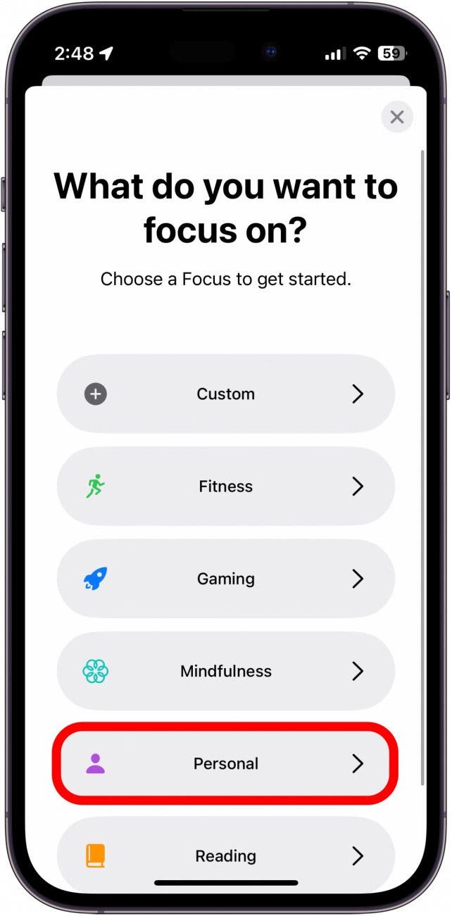 - First, I’ll set up Personal. This will be my daytime wallpaper while I’m not at work. If you don’t see Personal in your list of Focuses, tap the Plus icon in the top right.