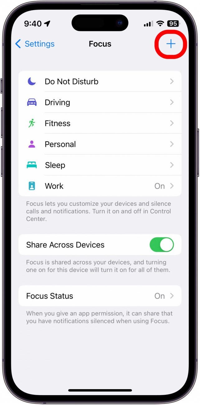 - Then, to create your own custom Focus mode, tap the Plus in the top right.
