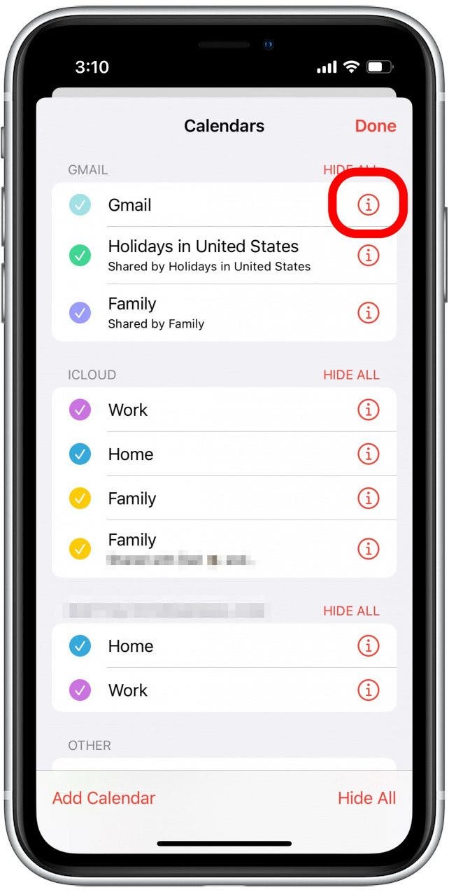 - Tap the info icon next to a calendar (it looks like an "i" inside a circle).