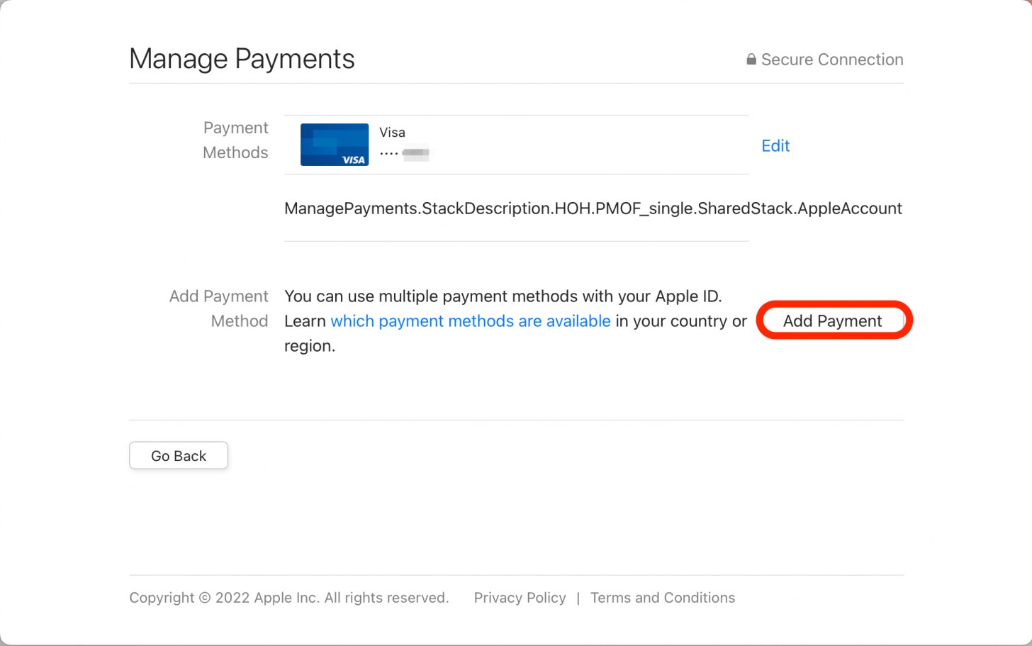 Note: Since the family organizer’s payment method is used for the Family Sharing group, only the family organizer can change the payment method. If you're not the family organizer, you'll have to ask that person to help you out.