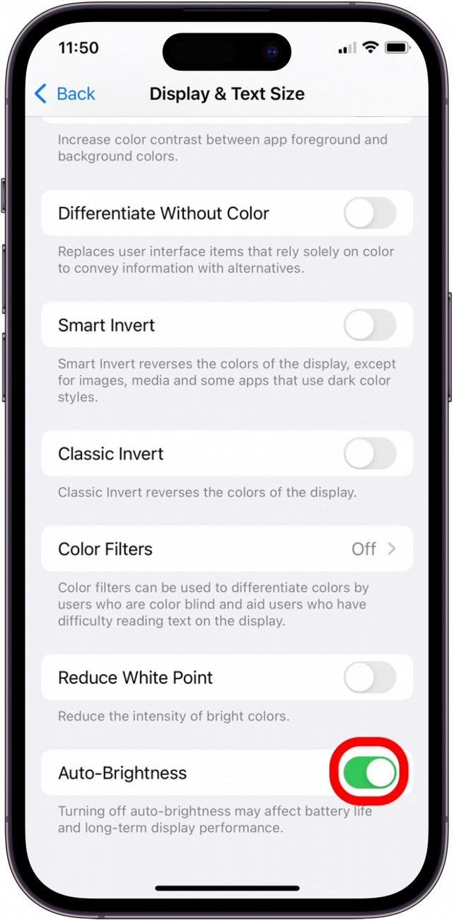 - Scroll all the way to the bottom and toggle Auto-Brightness off.