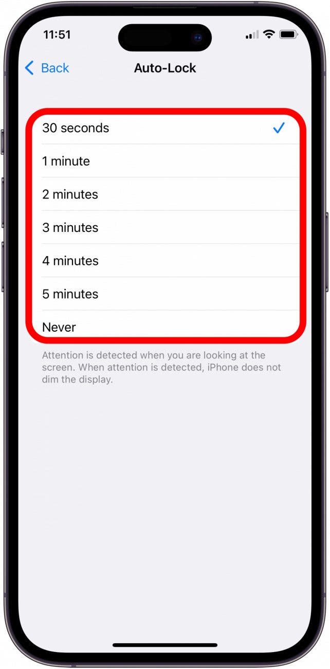 - Tap to set the lock feature to a time that works for you. If you set your iPhone's Auto-Lock to Never, make sure to lock your iPhone manually when not using it, otherwise you'll run down the battery.