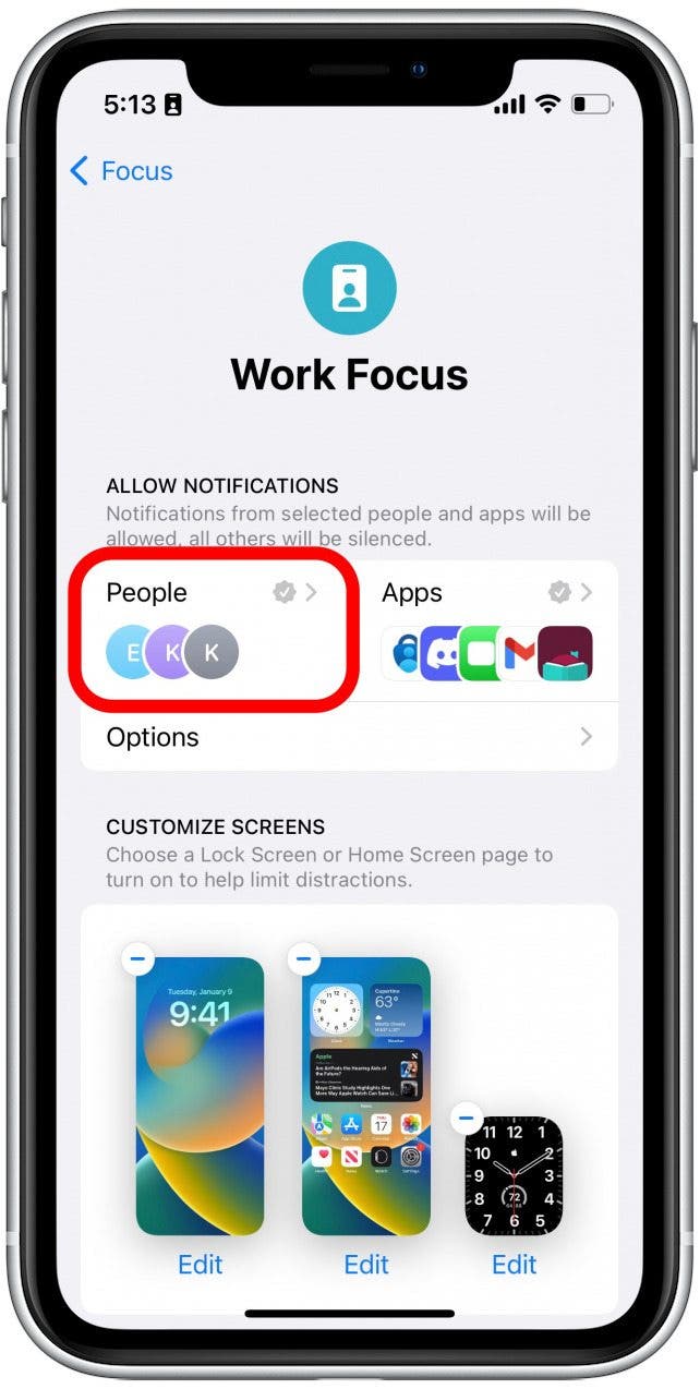 - You can also customize how notifications appear in this Focus. Tap People to select which contacts you want to allow notifications from.