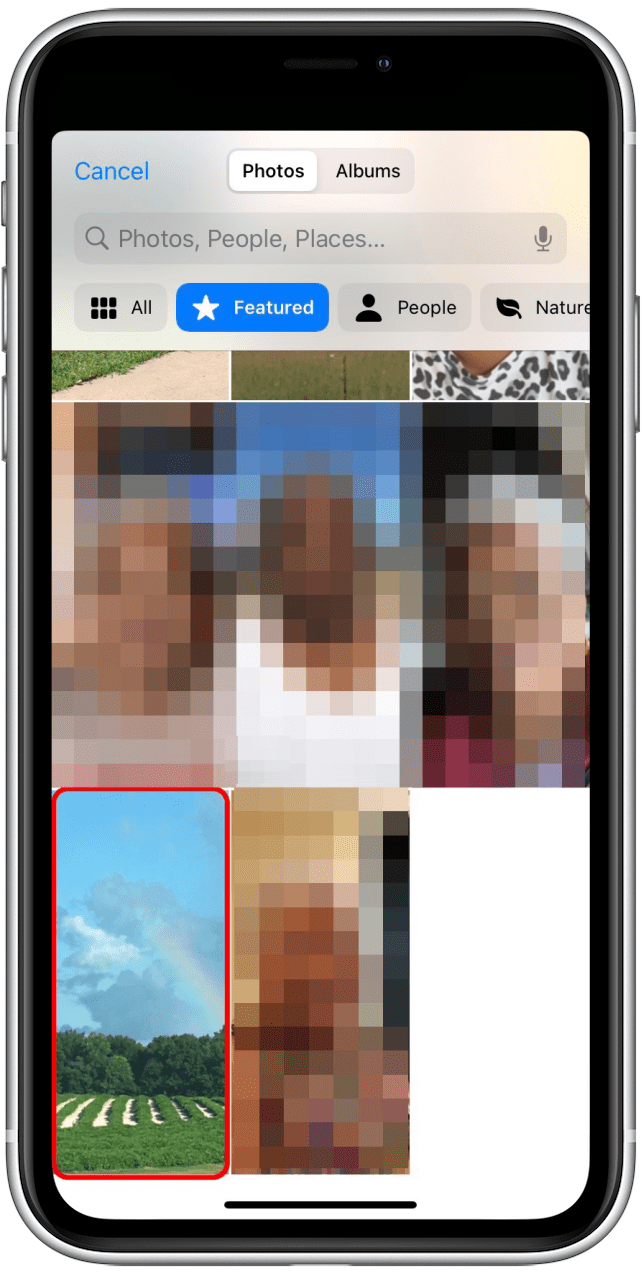- Here you can scroll to search for photos, type a search query into the search bar, or browse within your Albums. Tap the photo you wish to use.