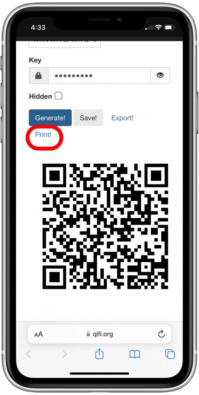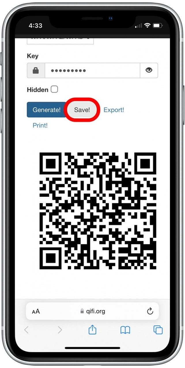 Now joining your Wi-Fi network will be easier than ever! If you choose to Export your QR code, it will be saved as an image in your Safari downloads. On an iPhone, you'll see a blue arrow appear on your Safari search bar. Tap the blue arrow and tap Downloads to open and save the image file in your app of choice.